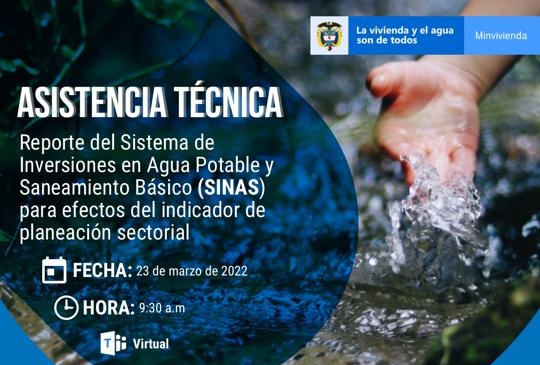 Reciban un respetuoso saludo de parte del Grupo de Monitoreo a los Recursos del SGP-APSB del Viceministerio de Agua y Saneamiento del Ministerio de Vivienda Ciudad y Territorio. Como es de su conocimiento, la Resolución MVCT 1010 de 2021 incluyó dentro de su Índice de Gestión Administrativa y Planeación, el Indicador Planeación Estratéfica Sectorial, en el cual se realizará el análisis y verificación al Sistema de Inversiones en Agua Potable y Saneamiento Básico (SINAS) de iniciativas o necesidades de proyectos de inversión, compromisos y usos, fuentes de financiación, línea base, metas y recursos a invertir para la mejora de los indicadores de cobertura, calidad, continuidad y aseguramiento, definidas por el municipio en el Plan de Desarrollo. Por lo anterior, este Ministerio realizará jornadas de asistencia técnica sobre el reporte del Sistema de Inversiones en Agua Potable y Saneamiento Básico (SINAS) para efectos del indicador de planeación sectorial, que para los municipios del departamento de Santander se realizará el día miércoles 23 de marzo de 2022, desde las 9:30 am, en el siguiente enlace: https://teams.microsoft.com/l/meetup-join/19%3ameeting_MjQ5N2M3YmEtM2EwMi00OGMxLWI2ODEtMjUxYWY2YWFkYmQy%40thread.v2/0?context=%7b%22Tid%22%3a%2259f85572-2867-4480-b111-fc473309f9b3%22%2c%22Oid%22%3a%22ef0268b4-f383-4e12-afd0-9db92f615b68%22%7d