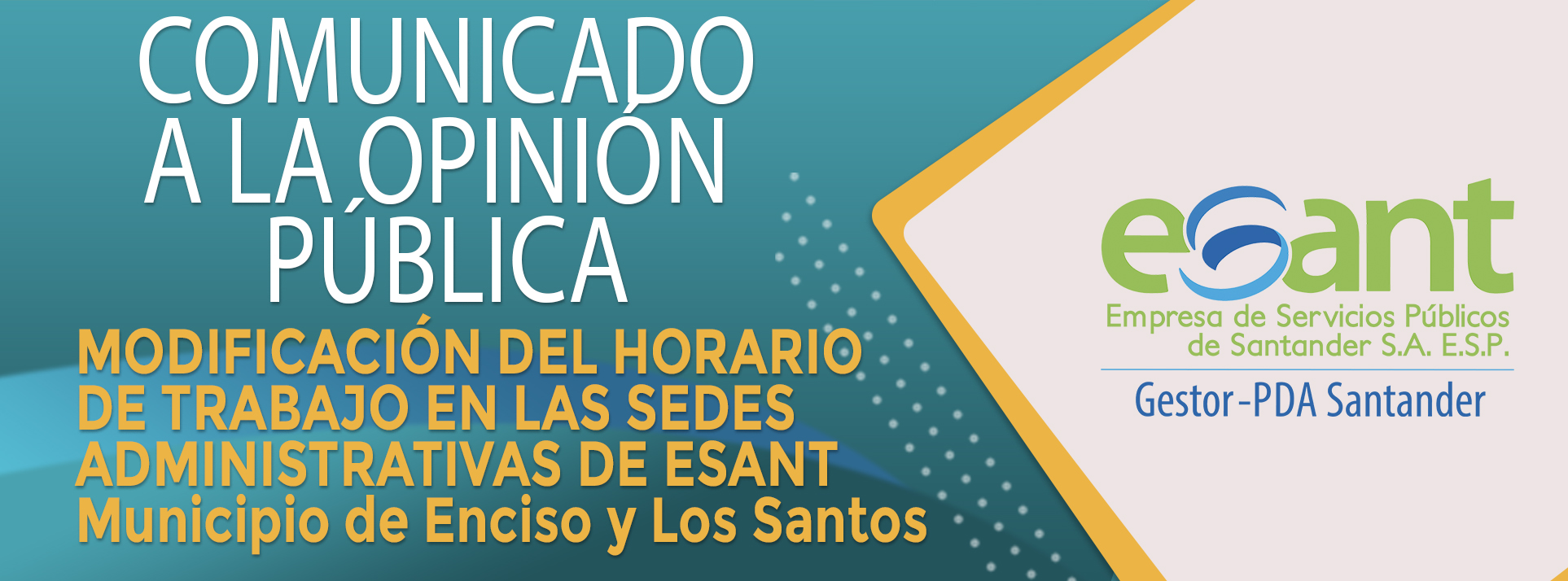 La Empresa de Servicios Públicos de Santander S.A ESP informa a los usuarios de los servicios públicos que presta la ESANT S.A ESP en los municipios de ENCISO y LOS SANTOS, SANTANDER que por motivos de la celebración de la semana mayor y la emergencia Sanitaria con ocasión de la situación epidemiológica causada por el COVID-19, las oficinas administrativas no prestarán servicio presencial durante los días 06 a 12 de Abril de 2020.