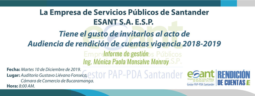 publicado por eladmin, 27/02/2019La gerente Ing. Mónica Paola Monsalve, tiene el gusto de invitar a los alcaldes municipales, asamblea departamental, concejos municipales, organismos de control, comités de desarrollo y control social y comunidad en general a la rendición de cuentas 2018-2019.